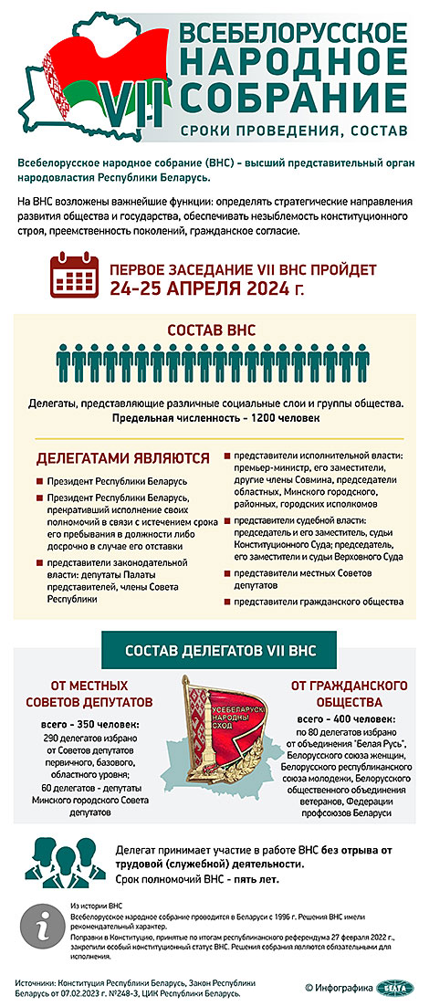 24 апреля, Минск /Корр. БЕЛТА/. VII Всебелорусское народное собрание пройдет в Минске 24-25 апреля под девизом "Время выбрало нас!", сообщает БЕЛТА.