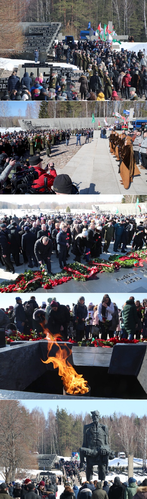 В мемориальном комплексе "Хатынь" состоялся митинг-реквием "Хай ніколі не змоўкнуць Хатыні званы". Его программа была построена с использованием приема погружения в историю, ведущего зрителей от событий 75-летней давности к современности. Состоялось возложение венков от главы государства, госорганов, общественных и религиозных организаций, дипкорпуса к Вечному огню. Глава Администрации Президента Наталья Кочанова зачитала обращение главы государства к соотечественникам по случаю 75-летия хатынской трагедии.