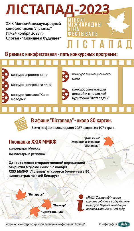 17 ноября, Минск /Корр. БЕЛТА/. XXIX Минский международный кинофестиваль (ММКФ) "Лістапад" пройдет с 17 по 24 ноября под слоганом "Созидаем будущее". Мероприятия фестиваля состоятся не только в белорусской столице, но и в других городах.