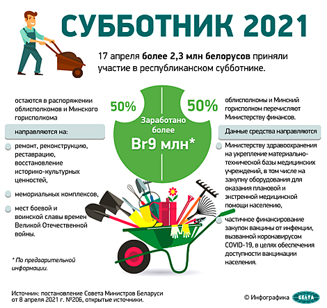 По завершении субботника половина заработанных средств направлены Министерству здравоохранения на укрепление материально-технической базы медучреждений, в том числе на закупку оборудования для оказания плановой и экстренной медицинской помощи населению и частичное финансирование закупок вакцины от COVID-19 для обеспечения доступности вакцинации для населения. Вторая часть осталась в распоряжении облисполкомов и Минского горисполкома. Их планируется направить на ремонт, реконструкцию, реставрацию, восстановление историко-культурных ценностей, мемориальных комплексов, мест боевой и воинской славы времен Великой Отечественной войны.