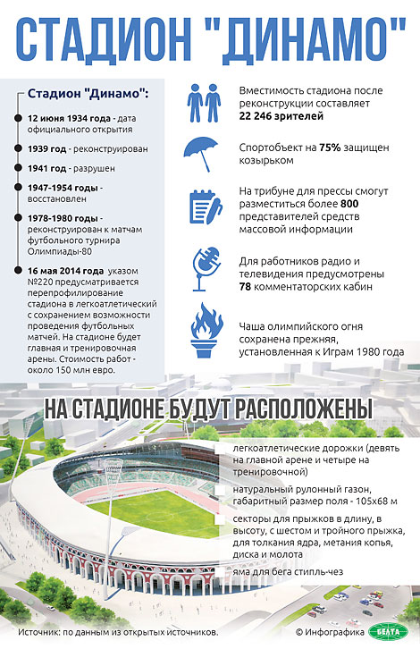 Вместимость стадиона "Динамо" после реконструкции составила более 22,2 тысяч зрителей. Трибуны на 70-80% защищены козырьком. В ложе прессы смогут разместиться более 800 представителей средств массовой информации. Для работников радио и телевидения предусмотрены 150 комментаторских кабин.