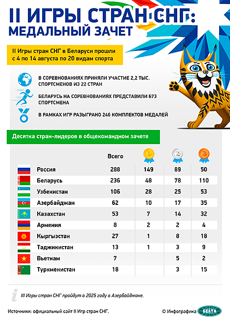 По итогам соревнований сборная Беларуси на II Играх стран СНГ завоевала 236 наград, из которых 48 золотых, 78 серебряных и 110 бронзовых, и заняла второе место в общем зачете спортивного турнира. Сборная России увозит на родину 288 медалей (149, 89, 50). Закрыла троицу лидеров команда Узбекистана, заовевав в общей сложности 106 наград, среди них 28 золотых, 25 серебряных и 53 бронзовых наград.