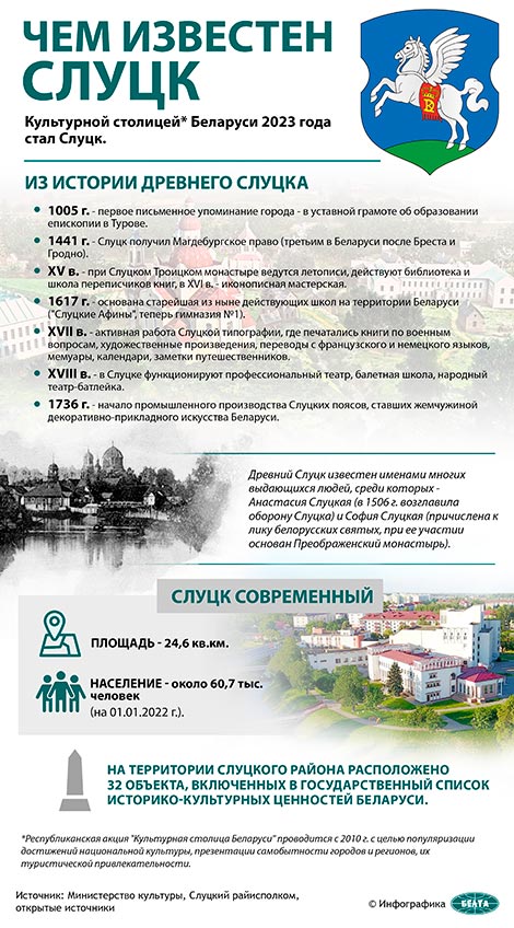 Слуцк официально вступил в права культурной столицы Беларуси 2023 года. Торжественная церемония открытия республиканской акции, которая проводится в стране с 2010 года, состоялась 24 февраля в городском Доме культуры. Ранее в Минской области этот значимый статус получали Несвиж (2012), Молодечно (2016) и Борисов (2021). В 2022-м культурной столицей был древний город на Витебщине Орша, который в череде многих событий года отметил и свою весомую дату – 955-летие. А в декабре передал эстафету Слуцку. Долгое время началом истории города считали 1116 год – по первому упоминанию в легендарной "Повести временных лет". Однако найдены документы, подтверждающие, что Слуцк гораздо старше. И в 2021-м официально было закреплено: город – центр крупного средневекового княжества – известен с 1005 г.