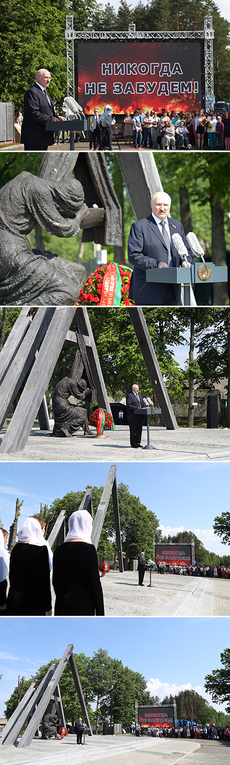 "Читая воспоминания очевидцев, глядя на чудовищные фото и кинохронику преступлений гитлеровских оккупантов, мы никогда не сможем понять, как солдаты, у которых есть мать, которые сами познали счастье отцовства, смогли убивать безоружных людей. Как они не увидели в наших стариках, женщинах и малышах хоть какое-то напоминание о своих родных людях. Уничтожали хладнокровно и методично, даже младенцев поднимали на штыки, экономя патроны…", - сказал глава государства.