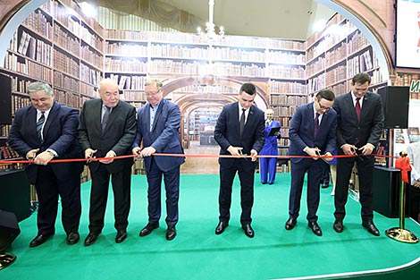 На снимке: ленточку разрезают председатель Союза писателей Беларуси Александр Карлюкевич, культурный деятель Михаил Швыдкой, президент Российского книжного союза Сергей Степашин, министр образования Андрей Иванец, министр информации Владимир Перцов, первый заместитель главы Администрации Президента Максим Рыженков