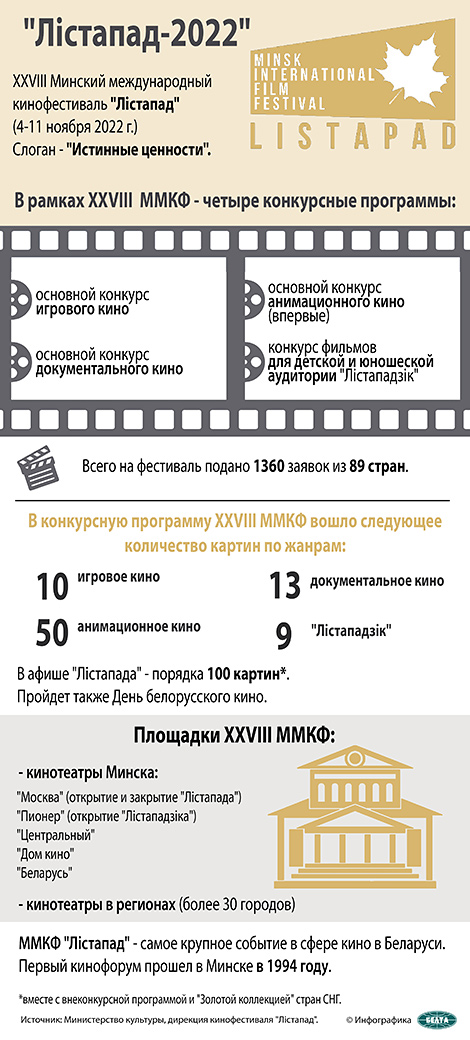 Любимый жителями и гостями Минска кинофестиваль "Лістапад" открылся 4 ноября в столичном кинотеатре "Москва" и уже в 28-й раз объединил поклонников под девизом "Истинные ценности". Фильмы из программы-2022 посвящены темам мира, сохранения земли, страны, любви, семьи, надежды, веры… Из рекордного количества заявок – 1360 из 89 стран – отобраны более 80 картин. В этом году зрителей ожидают 4 конкурсных программы – игрового, документального и – впервые! – анимационного кино, а также конкурс для детской и юношеской аудитории "Лістападзік".