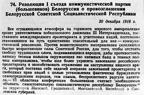 Резолюция I съезда КП(б)Б о провозглашении Белорусской Советской Социалистической Республики. 1918 год