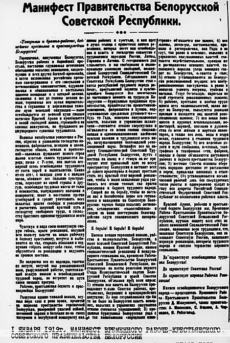 Вечером 1 января 1919 года было окончательно сформировано Временное рабоче-крестьянское правительство Беларуси. Председателем правительства был утвержден Дмитрий Жилунович. В этот же день по радио был обнародован Манифест Временного рабоче-крестьянского советского правительства Беларуси и в ночь с 1 на 2 января напечатан. В тексте Манифеста Беларусь провозглашалась "свободной независимой Социалистической Республикой", закреплялись основные положения ее общественного и политического строя.