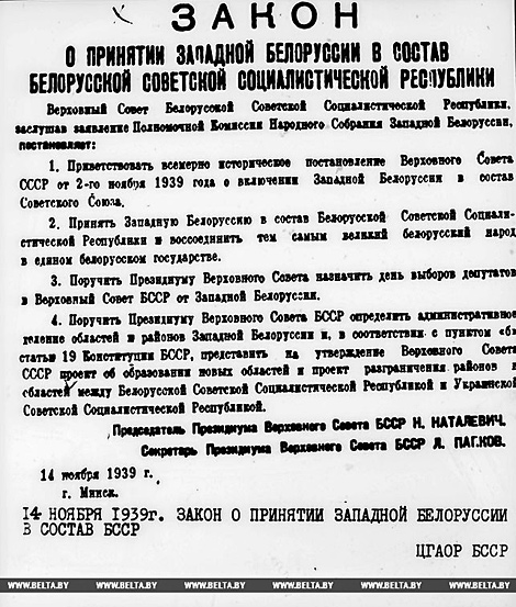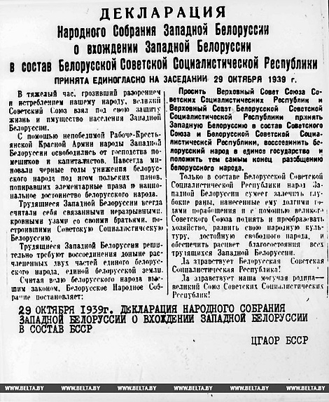 Заседание Народного собрания Западной Беларуси прошло 28-30 октября 1939 года в Белостоке. На нем была принята Декларация о провозглашении советской власти и вхождении Западной Беларуси в состав БССР. 2 ноября 1939 года внеочередная V сессия Верховного Совета СССР первого созыва решила удовлетворить просьбу Народного собрания Западной Беларуси и включить ее территорию в состав СССР, объединив ее с БССР. На внеочередной III сессии Верховного Совета БССР 14 ноября 1939 года был подписан закон "О принятии Западной Белоруссии в состав Белорусской Советской Социалистической Республики".