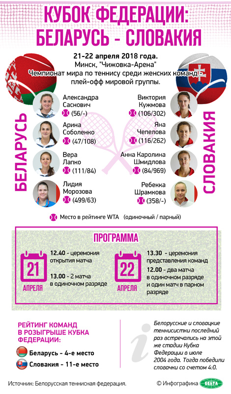 Ранее сборные Беларуси и Словакии только один раз встречались в матче Кубка Федерации. В 2004 году в Братиславе словацкие теннисистки победили со счетом 4:0 и сохранили прописку в элитном дивизионе. В мировом рейтинге женских команд Беларусь сейчас занимает 4-е место, Словакия находится на 11-й позиции.
