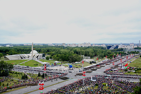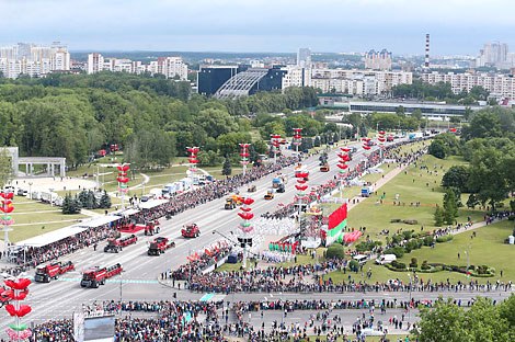 В День Независимости к 10.00 зрителей приглашают на традиционный парад войск Минского гарнизона (на котором обещают много сюрпризов) и массовый театрализованный эпизод "Мой родны кут" у стелы "Минск - город-герой". В его финале в небо поднимутся аэростат и тысяча шаров в цветах белорусского флага. На площадке у Дворца спорта состоится большой концерт творческих коллективов и исполнителей, праздничная ярмарка. Тематические гуляния закружат и тех, кто заглянет на территорию Верхнего города.