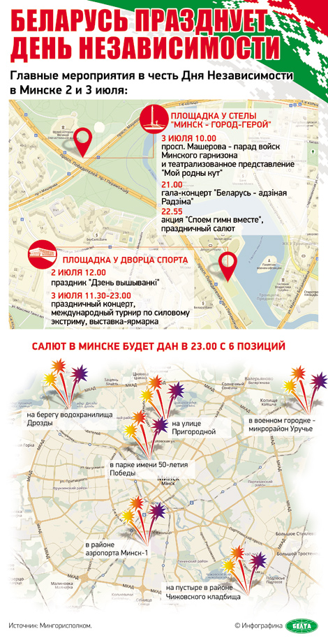 Вечером, в 21.00, на площадке у стелы "Минск - город-герой" начнется гала-концерт "Беларусь - адзiная Радзiма" - калейдоскоп всех регионов страны, поскольку артисты будут представлять свою малую родину. Кульминацией программы станет акция "Споем гимн вместе" (22.55) и, конечно, праздничный салют с 23.00. Красочное воздушное шоу возле стелы продлится 10 минут. Всего в столице определено шесть огневых точек: парк 50-летия Победы у стелы, улица Пригородная, аэропорт Минск-1, пустырь в районе Чижовского кладбища, пустырь в районе водохранилища Дрозды, а также военный городок - микрорайон Уручье.