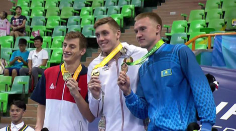 На дистанции 100 м брассом студент-спортсмен Белорусского государственного университета физической культуры Илья Шиманович открыл победный счет. Он поднялся на высшую ступень пьедестала совместно с американским спортсменом Эндрю Уилсоном, показавшим такой же результат - 1 мин. 00,15 сек. Третье место досталось атлету из Казахстана Дмитрию Баландину - 1 мин. 00,17 сек.