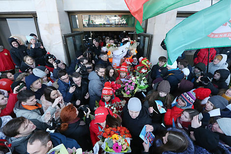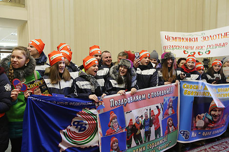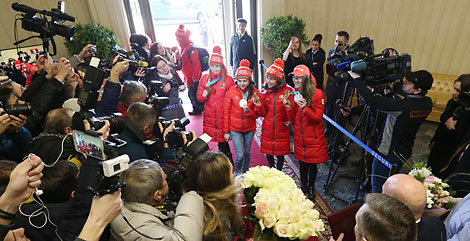 27 февраля, Минск /Корр. БЕЛТА/. Олимпийские чемпионки по биатлону в эстафете 4х6 км Надежда Скардино, Ирина Кривко, Динара Алимбекова и Дарья Домрачева, а также команды по конькобежному спорту, лыжным гонкам, горнолыжному спорту, медицинская и административная группы вернулись сегодня из Пхенчхана, передает корреспондент БЕЛТА.