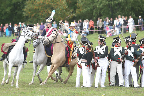 На целый день зрители погрузятся в 1812 год, в "эпоху последней красивой войны" - с балами, баталиями, дуэлями, народными кирмашами, шляхетскими пикниками и сабельными боями. Откроет фестиваль Гранд-Полонез, в котором по усадьбе пройдут прекрасные паненки и бравые офицеры. Затем начнется открытый гостевой бал. В нем смогут принять участие и зрители, причем танцмейстер научит движениям и па.