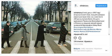 16 января, Минск /Корр. БЕЛТА/. Сотрудники посольства Великобритании в Беларуси воссоздали в Минске зимнюю версию знаменитой фотографии The Beatles. Соответствующую запись они разместили сегодня в официальном аккаунте диппредставительства в Instagram, сообщает БЕЛТА.