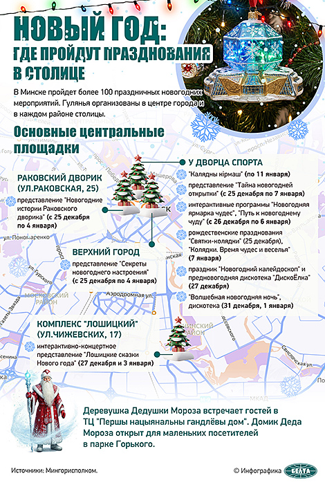 В саму новогоднюю ночь будут работать около 20 площадок в районах Минска. Основная же городская локация расположится у Дворца спорта. Туда стоит приходить 1 января с 00.10 до 4.00. Продолжится программа с 20.00 до 23.00.