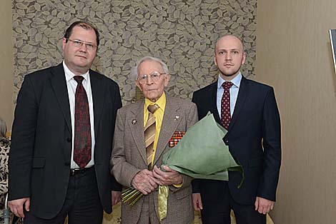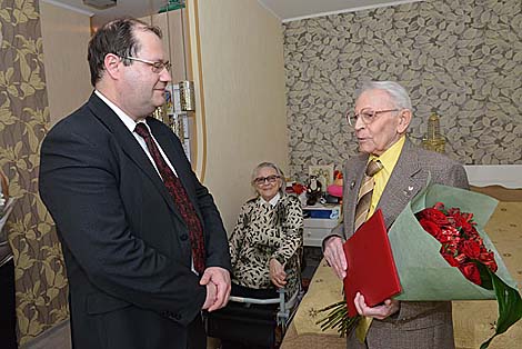 Дипломат пожелал юбиляру подольше оставаться в строю, сил, здоровья, счастья и благополучия и вручил цветы и подарки. "Для меня большая честь поздравить вас - защитника Брестской крепости - от имени нашего посольства с таким замечательным юбилеем. И особенно приятно сделать это в преддверии 75-летия освобождения Беларуси от фашистских захватчиков, - сказал Вадим Сенюта. - Именно на белорусской земле вы в числе первых приняли на себя жестокий вероломный удар агрессора и не покорились ему.