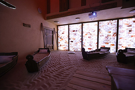 Также участникам пресс-тура показали бассейн с комплексом бань, спа-центр, комнаты для восстановления и релаксации (снежную, янтарную, песчаную, восковую), соляную градирню (своеобразный ингалятор под открытым небом), поле для мини-гольфа.