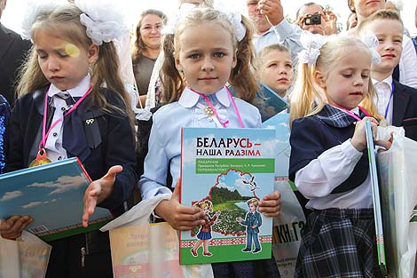 По доброй традиции почетные гости вручили самым маленьким ученикам книги "Беларусь - наша Радзіма" - подарок первоклассникам от Президента. Торжественная линейка продолжилась общешкольным тематическим мероприятием "Пісьменства і друк Беларусі - крыніца культуры і духоўнасці народа".