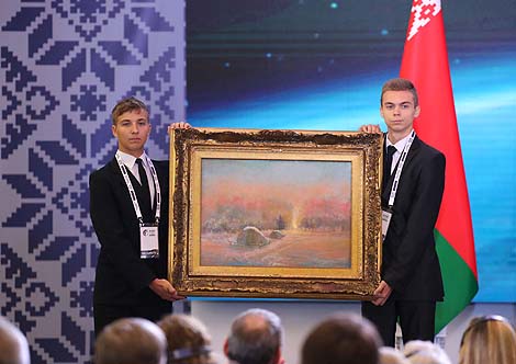 10 сентября, Минск /Корр. БЕЛТА/. Президенту Беларуси Александру Лукашенко сегодня на церемонии открытия XXXI Международного конгресса Ассоциации участников космических полетов подарили картину, написанную Алексеем Леоновым - первым человеком, побывавшем в открытом космосе, передает корреспондент БЕЛТА.