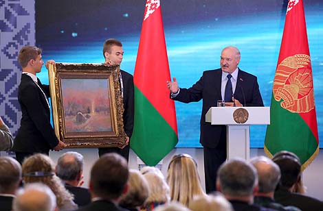 Глава государства заявил, что эта картина будет подарком всему белорусскому народу и займет почетное место во Дворце Независимости. Однако прежде она будет демонстрироваться участникам конгресса. "Чтобы она напоминала, что Алексей вместе с нами, он рядом. Потому что такое творение драгоценно. Оно бесценно", - подчеркнул он.