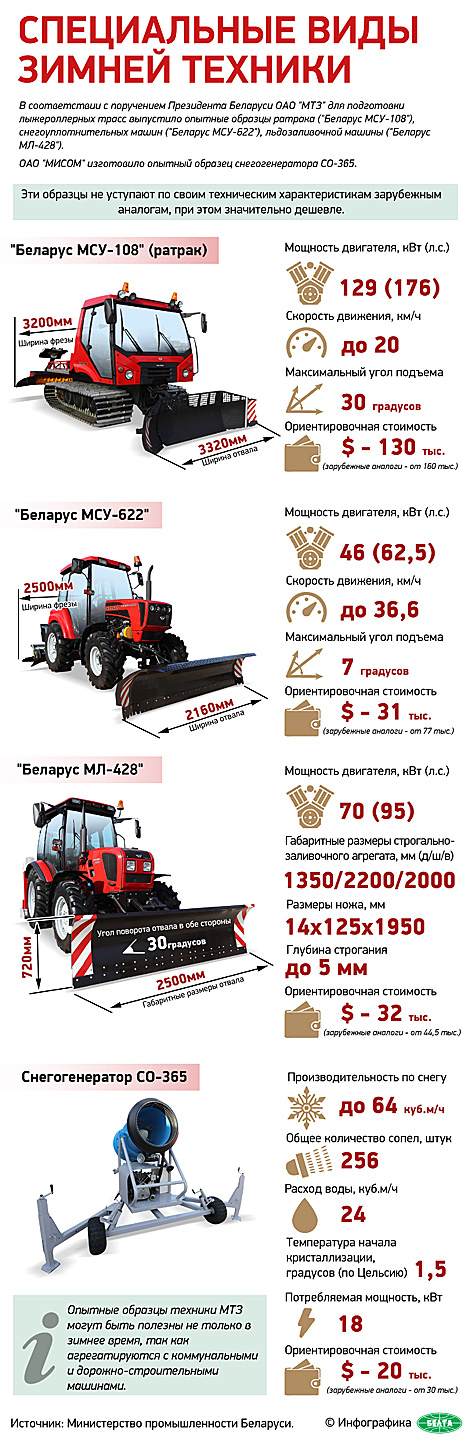 Глава государства ознакомился с несколькими белорусскими ратраками (снегоуплотнительная машина для подготовки лыжных трасс) Минского тракторного завода "Беларус МСУ-2022", МСУ-622 и МСУ-108, льдозаливочной машиной "Беларус МЛ-428" и снегогенератором СО-325, разработанным на предприятии "Мисом ОП".