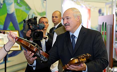 Тут же главе государства показали и первую белорусскую скрипку ручной работы. Ее за полтора месяца сделал декан факультета традиционной белорусской культуры и современного искусства БГУКИ Александр Сурба. Он использовал клен, ель, красное дерево. В Беларуси подобный инструмент могут произвести только три-четыре мастера. В год каждый готов выпускать восемь скрипок, всего музыкальные и образовательные учреждения нуждаются в 147 инструментах.