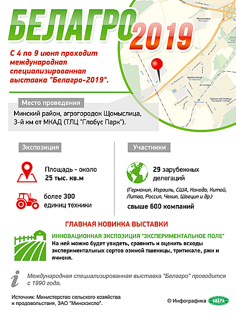 4 июня, Минск /Корр. БЕЛТА/. Торжественное открытие международной специализированной выставки "Белагро-2019" состоится сегодня в торгово-логистическом центре "Глобус Парк" в агрогородке Щомыслица Минского района, сообщили БЕЛТА в Министерстве сельского хозяйства и продовольствия.