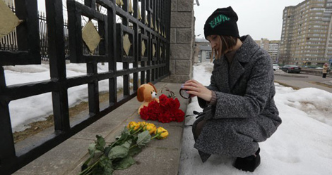 26 марта, Минск /Корр. БЕЛТА/. Минчане несут цветы к посольству России в Беларуси в связи с трагедией в результате пожара в торгово-развлекательном центре в Кемерово, передает корреспондент БЕЛТА.