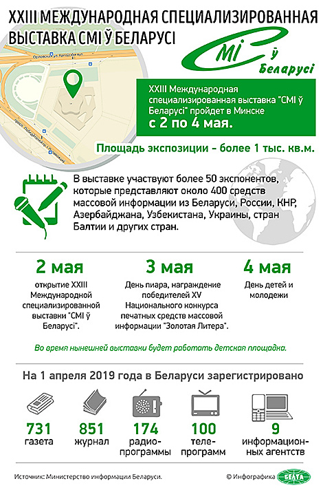 XХIII Международная специализированная выставка "СМІ ў Беларусі" пройдет с 2 по 4 мая в административном комплексе по проспекту Победителей, 14. Ожидается участие не менее 100 экспонентов, представляющих около 500 печатных средств массовой информации, теле- и радиопрограмм и каналов из Беларуси, России, КНР, Болгарии, Литвы, Азербайджана, Украины, Латвии, Индии, Германии, Турции, Грузии и других стран. Общая площадь выставочной экспозиции составит более 1 тыс. кв.м.