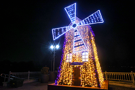 Праздничное убранство на площади Ленина в этом году немного изменили. Например, мастера трансформировали масштабную инсталляцию с силуэтами городских достопримечательностей: к "Звезде" Брестской крепости, шпилю вокзала Брест-Центральный, музею "Берестье", областному краеведческому музею и театру кукол добавили шестой элемент. Это очертания въездной стелы в Брест. В целом длина конструкции получилась 60 м, а высота превысила 8 м.