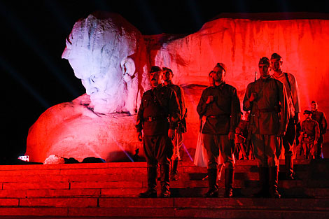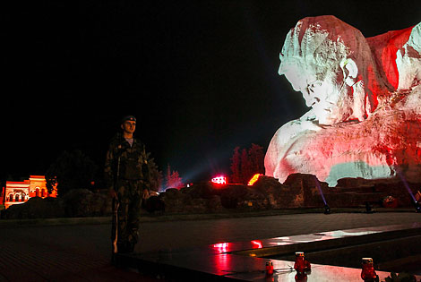 Траурная церемония началась в половине четвертого утра с лазерной постановки "Вторжение" под фонограмму из знаменитой симфонии Дмитрия Шостаковича. Предрассветную тишину разорвали пулеметные выстрелы и залпы артиллерийской батареи. На установленном у Вечного огня экране сменялись фотографии защитников крепости. Ведущие рассказывали истории их героической гибели.