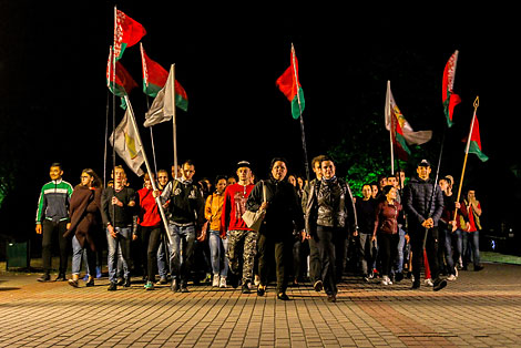 Вместе с брестчанами все они прошли сегодня символической "Дорогой памяти". Путь от главного входа в мемориал - "Звезды" - до площади Церемониалов освещали прожекторы, фонари, лампады. На экранах демонстрировались кадры советской довоенной кинохроники. В это время циферблат отсчитывал последние часы и минуты мирной жизни.