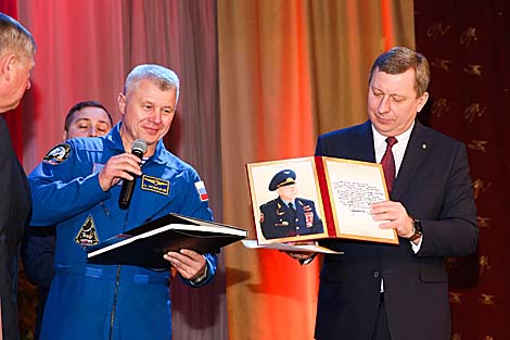 Церемония состоялась в Доме культуры железнодорожников. Почетную миссию выполнил летчик-космонавт Герой России Олег Новицкий. "Брест для меня всегда был городом мужества. Подвиг бойцов, которые защищали Брестскую крепость на рубежах страны в 1941 году, меня очень впечатляет. Я горжусь, что именно мне выпала честь передать это поздравление жителям Бреста от человека такой величины", - отметил космонавт. Он сообщил, что данная инициатива принадлежит начальнику Минского аэроклуба имени С.И. Грицевца летчику-испытателю Николаю Мочанскому. "Алексей Архипович на тот момент плохо себя чувствовал. Но когда прозвучали слова "Брест" и "Брестская крепость", сразу пошел навстречу и собственноручно подписал поздравление. Это дорогого стоит", - сказал космонавт.