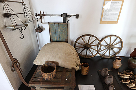 На первом этаже музея все посвящено хлебу, крестьянскому быту и работе в поле. Здесь собраны плуг, ступы, дежа для хлебной закваски, серпы, косы, глиняные горшки, в том числе сдвоенные, в которых на поле носили обед для косцов и жниц, и многое другое. Всего и не перечесть. И еще в коллекции музея можно увидеть древнюю "мельницу": ступу в виде большого камня с выемкой и круглым "пестиком" - камнем, которым в древности перетирали зерно. Ее обнаружили при раскопках в Орше, и она заняла свое почетное место среди аутентичных экспонатов в постоянной "хлебной" выставке музея.