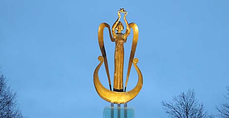 Установлен памятный знак в городском сквере на площади Строителей. Знак высотой около 4 м представляет собой фигуру музы, в руках которой лилия - символ города (она изображена на гербе Новополоцка). Фигура стоит на ладье в виде лиры. Образ подчеркивает, что всю жизнь нас сопровождает творчество в различных его проявлениях. Автор композиции - уроженец нефтеграда Дмитрий Оганов.