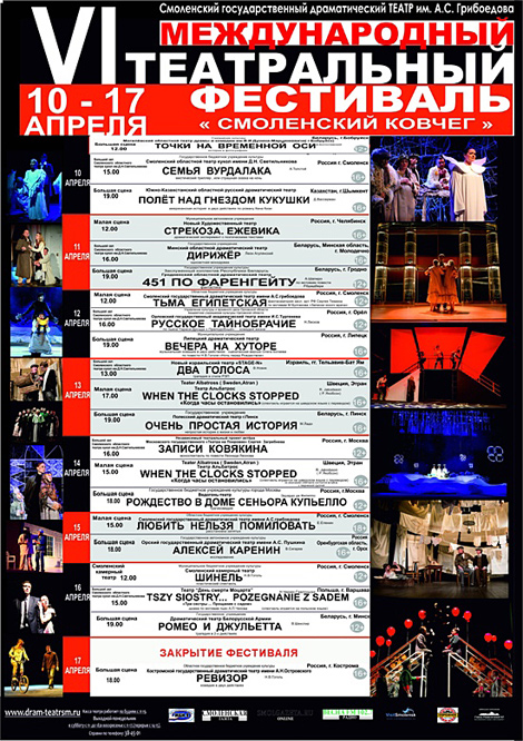 На нынешнем форуме в Смоленске выступят театральные коллективы из России, Казахстана, Швеции, Польши. Ожидается, что Беларусь, кроме пинчан, представят Могилевский областной театр драмы и комедии им. В. И. Дунина-Марцинкевича, Минский областной драматический театр, Гродненский областной драматический театр, а также Драматический театр Белорусской Армии.