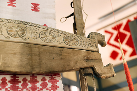 Мастерица рассказывает об устройстве станка, в деталях разъясняя значение каждого элемента. В центре ткачества несколько таких масштабных деревянных конструкций, некоторые из них содержат еще части довоенного периода.