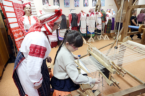 Девочка приехала из Казахстана и с удовольствием изучает белорусское ремесло. Раньше здесь занималась ее старшая сестра, теперь настала и ее очередь. "Мне здесь все нравится. Очень люблю желтый, розовый, зеленый", - делится она своими предпочтениями. "Очень жизнерадостные цвета, это уже современный неглюбский стиль", - улыбается Татьяна Суглоб.