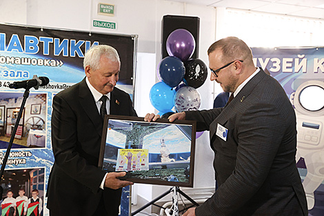С приданием музею нового статуса учащихся и педагогов поздравил председатель Брестского облисполкома Петр Пархомчик. Пришел, конечно, не с пустыми руками. "Тут определенные книги. Думал, они займут почетное место в моей домашней библиотеке. Но потом понял, что в Томашовке есть уже народный музей космонавтики, и принял решение передать книги в ваше учреждение, а еще картину. Наш Президент сказал, что Марина Василевская не последний белорусский космонавт, который покорит космос. Вероятно, среди присутствующих здесь у кого-то есть такое желание, - сказал Петр Пархомчик. - Нужно стараться как можно лучше учиться, быть физически развитым. Такие полеты - сумасшедшее напряжение, и не каждый человек в состоянии выдержать его. Если кто-то задумался, будем поддерживать. И, возможно, через какое-то время еще один космонавт из Томашовки покорит космос".