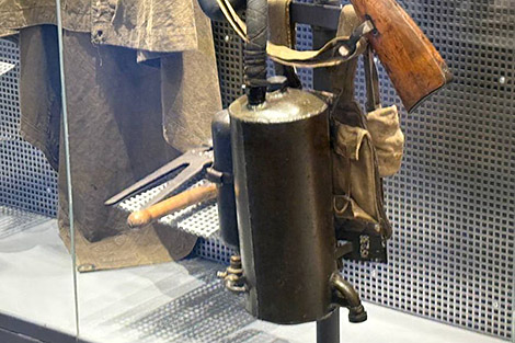 В одной из витрин, где представлены образцы стрелкового оружия, можно увидеть достаточно редкий для военных музеев экспонат: огнемет образца 1942 года.