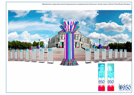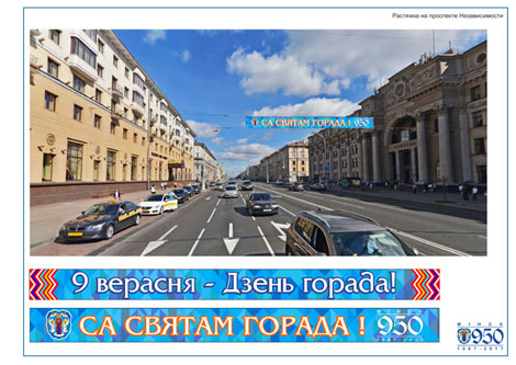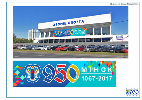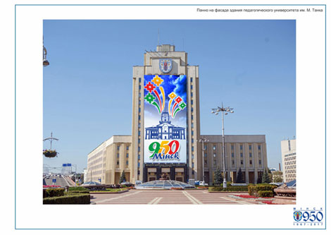 Возле стелы "Минск - город-герой" можно будет увидеть 9-метровые цифры 950 и надпись Minsk. На фасаде педагогического университета им. М.Танка появится панно с изображением ратуши и салюта, а на площади Независимости - куб с символикой Минска.