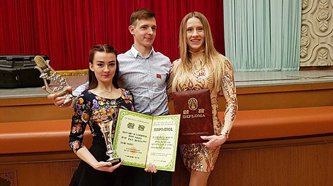Артисты Белгосцирка Вероника Рыбчонок и Максим Виноградов с номером "Воздушные гимнасты на полотнах" отмечены в номинации "Групповой номер", а Алена Климович с номером "Антипод" - в номинации "Сольный номер".
