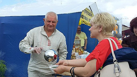 Экспозиция развернулась на площадке "Молодежная", где сельские усадьбы и их партнеры презентуют свои турпродукты. Гостей встречают ухой, шурпой, домашними сырами, медом и другими вкусностями. Одна из изюминок площадки в том, что здесь угощают всех желающих живой водой из святых источников Могилевской области: Трофимовой криницы (Шкловский район), Голубой криницы (Славгородский район), Каскада криниц Захаренка (Быховский район).