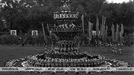 Фрагмент спортивно-художественной композиции пирамида на закрытии III Всебелорусской спартакиады на минском стадионе. 1947 г.