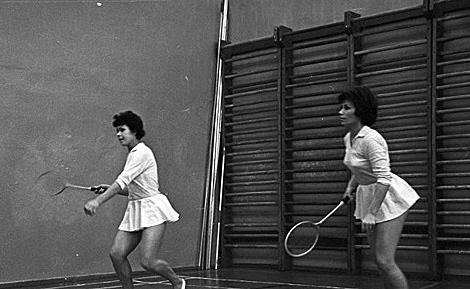 Чемпионки БССР по бадминтону в парных встречах Л.Н.Зотова , Г.Пермикова во время игры в Могилеве, 1962 г.