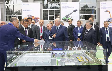 На предприятии президентам продемонстрировали необычное шоу - танец погрузчиков и трюки на экскаваторах, которые собираются в Ташкенте. Свои возможности по маневрированию продемонстрировали универсальные погрузчики с бортовым поворотом "Амкодор А211Е", а водитель фронтального одноковшового погрузчика "Амкодор 352" смог зубом ковша закрыть спичечный коробок. Еще более необычные навыки показал водитель экскаватора-погрузчика "Амкодор 732". Оператор, управляя ковшом с помощью джойстика, сумел снять кепку с вешалки и подать ее себе в кабину, а затем зубом ковша забил гвоздь в колоду.