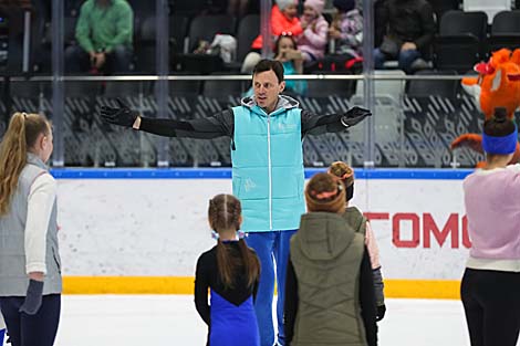 Алексей Ягудин, олимпийские чемпионы в парном катании Татьяна Тотьмянина и Максим Маринин и детский тренер Полина Шелепень провели мастер-класс для юных спортсменов, участие в нем приняли около 250 мальчиков и девочек.