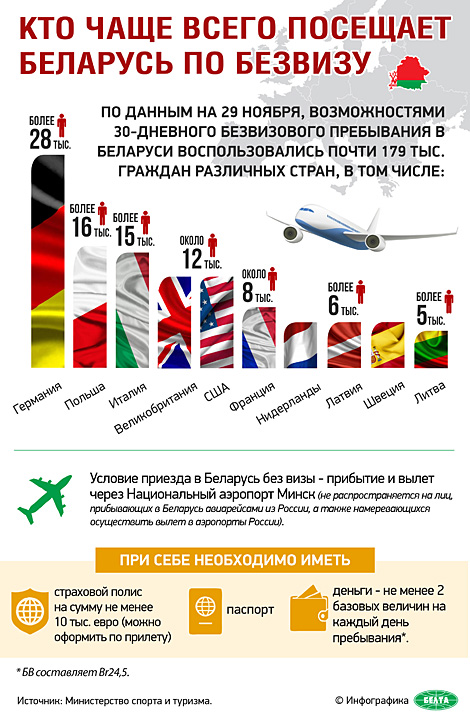 Как сообщалось, срок безвизового пребывания в Беларуси продлен до 30 дней при условии въезда в страну и выезда через Национальный аэропорт Минск. При себе нужно иметь паспорт, деньги (на каждый день пребывания сумму в валюте или белорусских рублях, эквивалентную не менее чем двум базовым величинам, либо 50 базовым величинам, если пребывание составит полные 30 дней), действующий в Беларуси медицинский страховой полис на сумму не менее 10 тыс. евро.